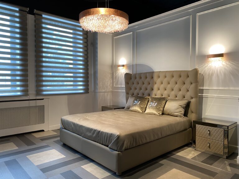 Luxusní manželská postel VOGUE od DV Home je symbolem elegance, glamour stylu a nejvyšší kvality italského designu. Vysoké čalouněné čelo s precizním prošíváním capitonné je potaženo exkluzivní kůží ZAFFIRO, která dodává ložnici noblesní a reprezentativní vzhled a okamžitě přitahuje pozornost.